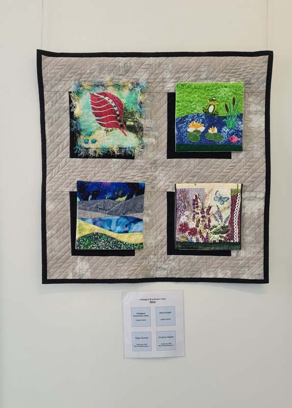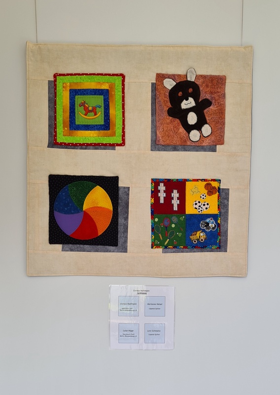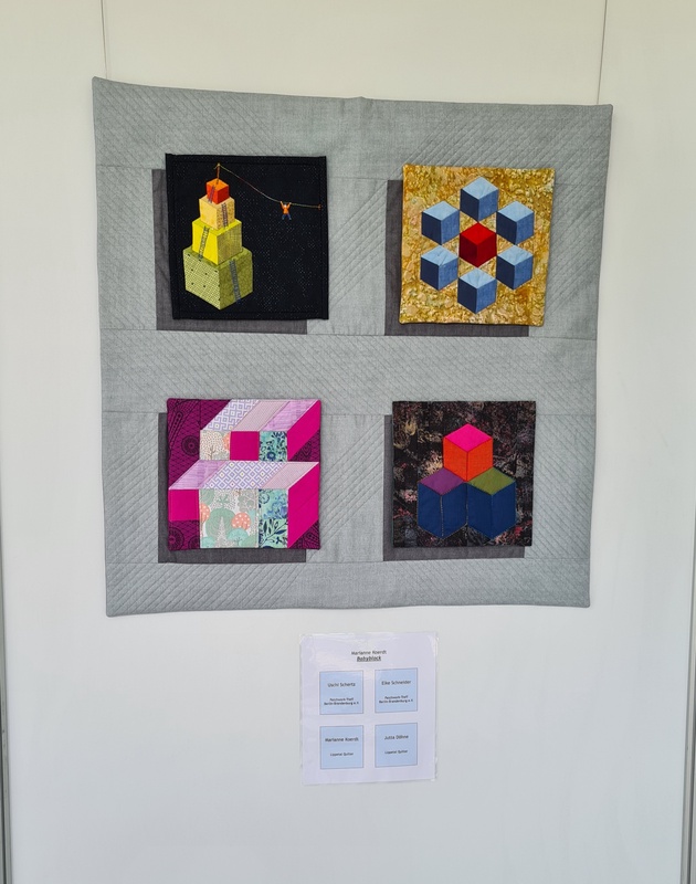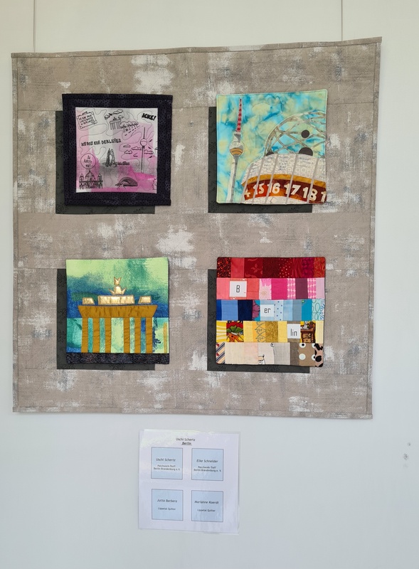 Die Ausstellung zeigte das Quiltgeheimnis Berlin und Lippetal. Jede Quilterin teilte ihr Lieblings-Thema "geheim" der jeweiligen regionalen Ansprechpartnerin mit. Diese bildeten 12 Vierergruppen. 2 Berlinerinnen und 2 Lippetalerinnen und teilten diesen, ihre zu nähenden Themen mit. Jede nähte 3 Themen für die Gruppe und ihr eigenes Thema. Dann wurden drei Themenquadrate getauscht. Die vier Quadrate wurden dann auf einer Pinnwand für kleine Quilts befestigt.